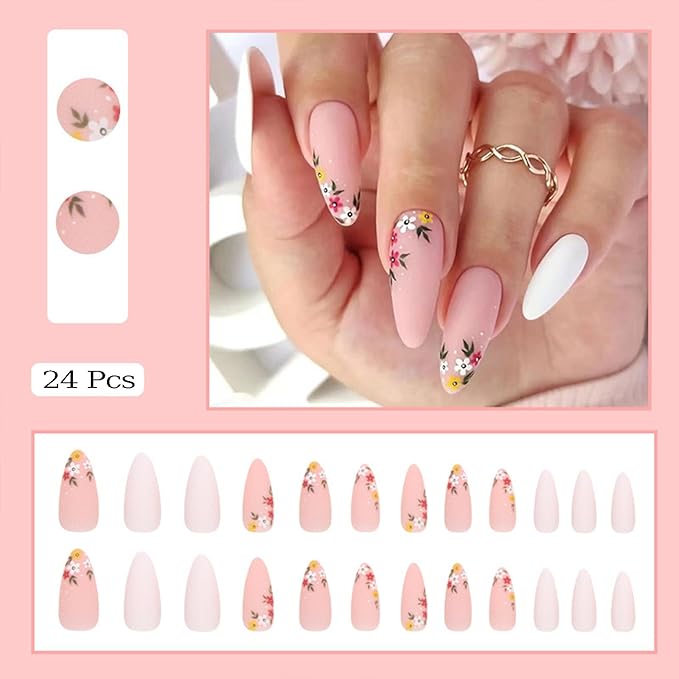 Almond Press on Nails - Pink Nude False Nails with French Flower Designs, Glossy Full Cover Stick on Nails for Women & Girls - 24pcs