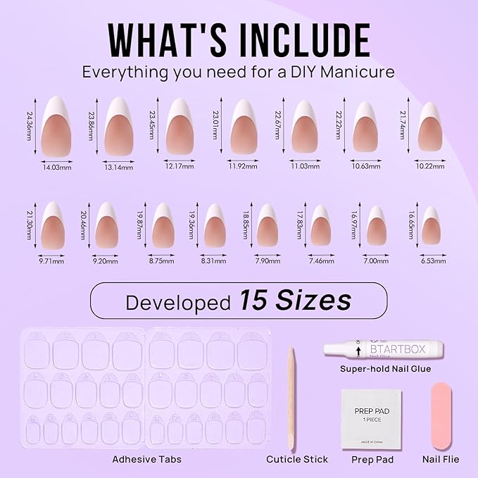 - What's Include:15 nail sizes ensure a totally custom fit, plus we give you everything needed just in case! Each set comes complete with a storage box, nail glue, adhesive tabs, double-sided nail file, cuticle stick, and prep pad