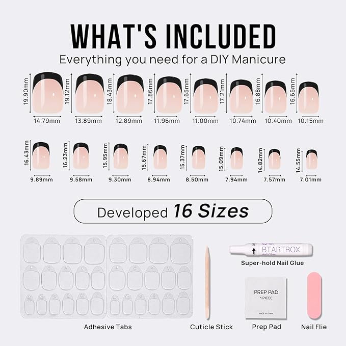 BTArtbox Press on Nails Square - Black French Tip Press On Nails Short, Glue On Nails for Women Gifts, Natural Stick On Nails in 16 Sizes - 32 Fake Nails Kit