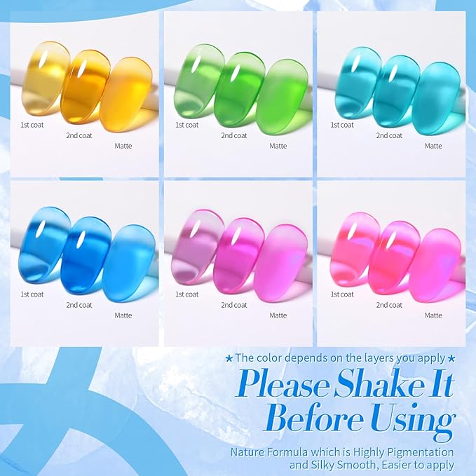 - EASY APPLICATION AND GOOD TENACITY: The series of jelly crystal gel nail polish set is long lasting for 21+ days with perfect shine under proper application - With base gel top coat under the full application process.High durability and intense pigmentation makes it stay last longer and brings you brilliant shine finish.