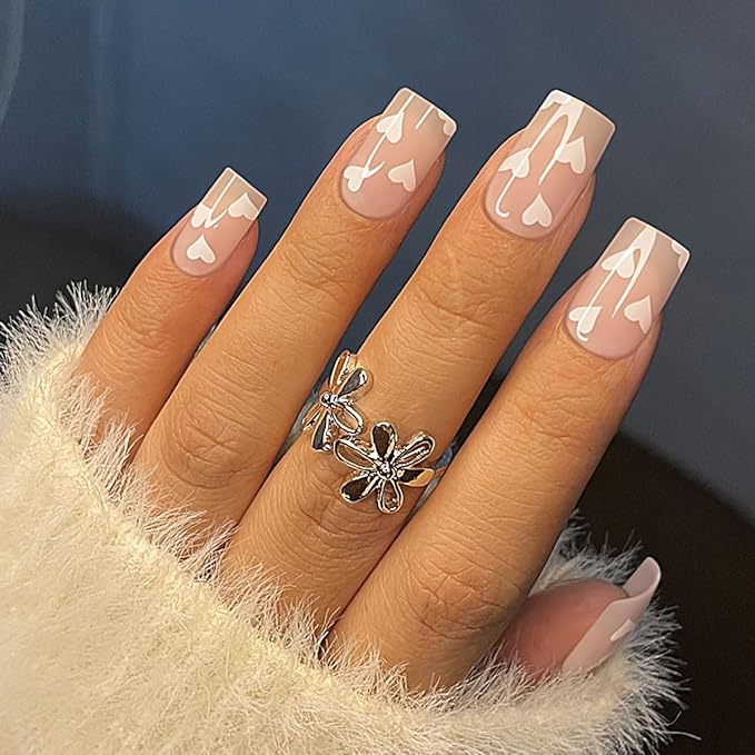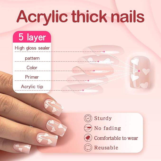 Yivaiks White Acrylic Press on Nails Valentines Day Glue on Nails Short Fake Nails Heart Stick on Nails Full Cover Artificial Nails Press ons Short Nails Kit 24pcs