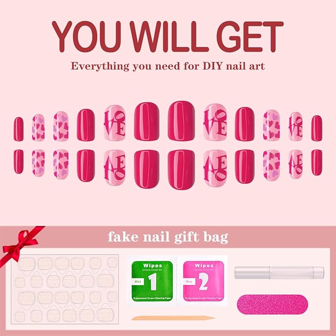 - 🌟press on nail kit: 24pcs/12 sizes of pink press on nails (multiple sizes to fit your nails comfortably), 1 nail file, 1 glue stick, 24 pieces of jelly glue. 1 cleaning cloth, 1 wooden stick. (jelly glue is not as durable as liquid glue, but it allows the long nails to be reused, so please use the appropriate glue for different scenarios.)