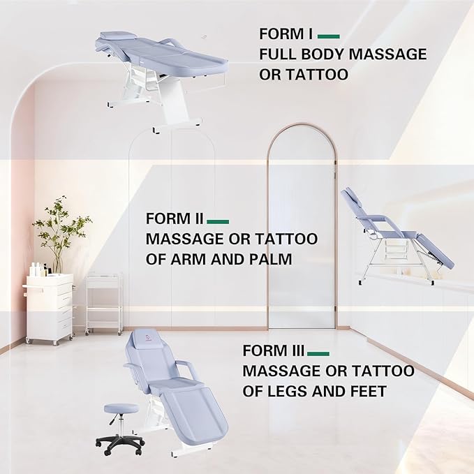 - 【Wide Use】 This 3-section design portable massage spa bed works as a full-body massage bed, facial chair, or even as a tattoo chair that can recline to various positions as needed. Suitable for professionals in the salon, spa, or massage centers such as massage, facials, tattoos, eyelash extensions, eyebrow waxing or threading, microblading, beauty, and other salon needs.