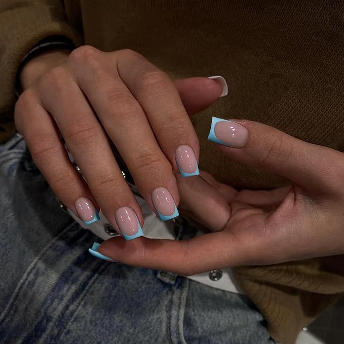 - How Natural They Are: These sky blue French press on nails square nails designs look very natural,with a perfect that fits your nail bed,and a nude pink base color that gives the appearance of real nails.French tip press ons nails Red can create your own fingertip art and make your nails your fashion statement!With short press on nails French tip,you can achieve a natural, elegant look without the salon visit