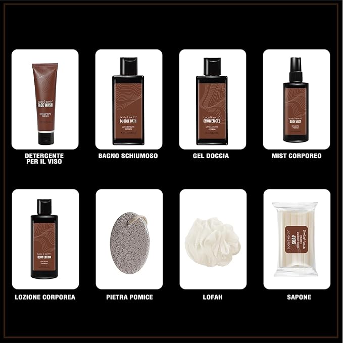 - Gift Baskets for Men: Includes shower gel, bubble bath, face wash, body lotion, body mist, soap, pumice stone, and loofah; Infused with soothing sandalwood, each product cleanses, soothes, and softens your skin