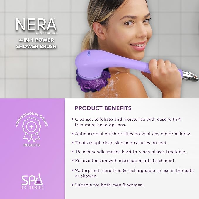 - IN - HOME SPA - The NERA body brush tool transforms everyday showers into a spa-like cleansing experience. This device is designed for simple, effective, and painless exfoliation in the comfort of your own home. This NERA includes everything you loved about the original with more features and accessories to level up your showers!