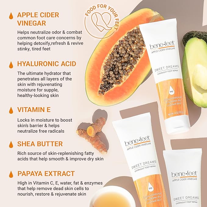Benefeet Sweet Dreams Overnight Foot Repair - Night Cream for Detox, Moisturize & Soften Dry Cracked Skin, With Apple Cider Vinegar, Turmeric & Borage Oil, 4oz (3 Pack)