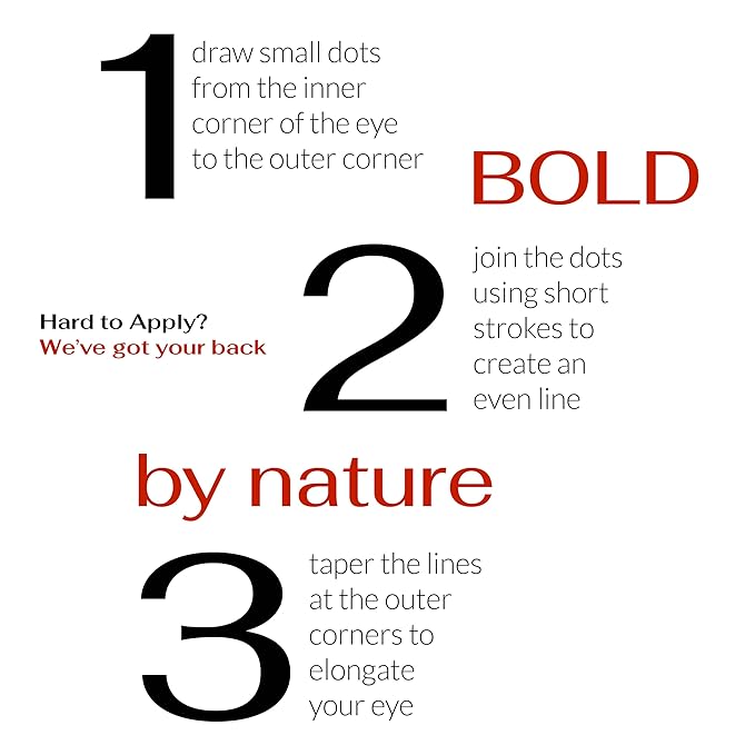 - EASY APPLICATION WITH 3 FOOL-PROOF STEPS: Create the perfect winged cat-eye with our long-lasting eyeliner that smoothly glides on your eyelids. First, draw small dots from the inner corner of your eye to the outer corner while keeping as close to your lash line as possible. Then, join the dots using short strokes to create an even line on your upper and/or lower lash line(s). Lastly, taper the lines at the outer corners to elongate your eye and voilà!