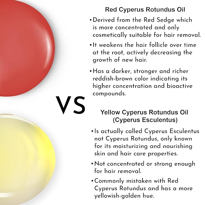 - COLOR AND CONCENTRATION COMPARISON: It has a darker, stronger and richer reddish-brown color with a strong earthy scent (black pepper) indicating its high concentration. Commonly mistaken with Yellow Saad Oil (Cyperus Esculentus) retaining a more golden hue and milder scent. Known for its moisturizing and nourishing skin/hair care properties and is not for hair removal (don't be misled by trending imitations).