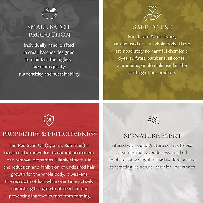 - PROPERTIES AND EFFECTIVENESS: The Red Saad Oil (Egyptian Cyperus Rotundus) is traditionally known for its natural permanent hair removal properties. Highly effective in the reduction and inhibition of undesired hair growth for the whole body. Weakens the regrowth of hair while over time actively diminishing the growth of new hair and preventing ingrown bumps from forming. Noticeable effects within the 1st week when used as directed.