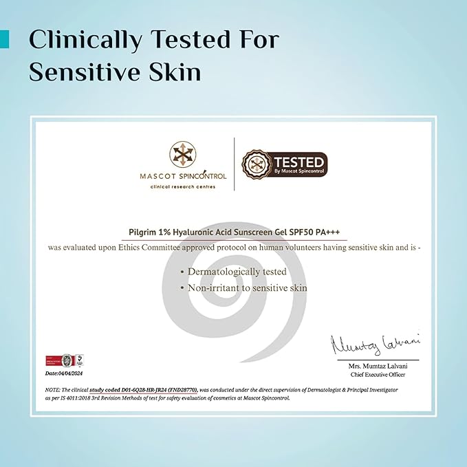 Pilgrim 1% Hyaluronic Acid Sunscreen Gel SPF 50 PA+++ | Broad Spectrum UVA/UVB & Blue Light Protection | Lightweight, Non-Greasy, Fast-Absorbing, Hydrating Aqua Gel | Face & Body | 1.76 Oz (50gm)