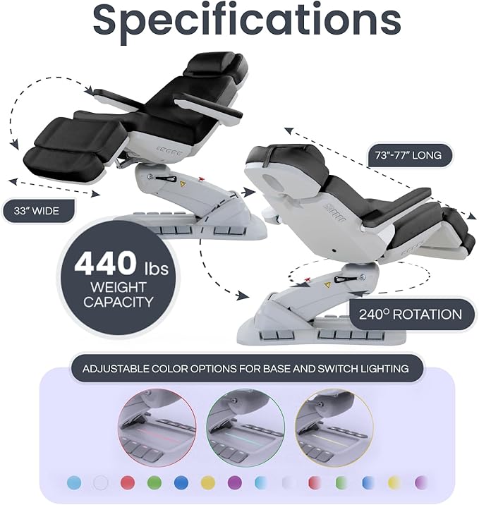 - COMPREHENSIVE CONTROL SYSTEM: Features intuitive back control panel with memory settings, reset button, secure locking function, safety sensors, emergency stop switch, customizable LED lighting, fully adjustable headrest and removable armrests. This professional facial chair for esthetician use combines safety features with convenience, offering the ultimate service bed experience for both clients and technicians.