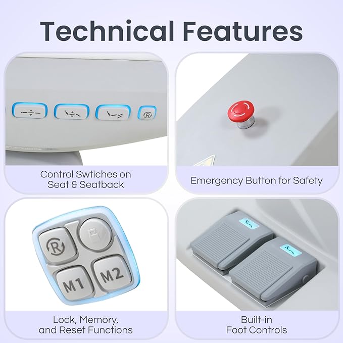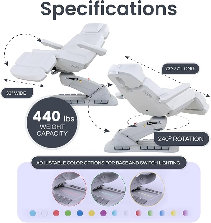 - COMPREHENSIVE CONTROL SYSTEM: Features intuitive back control panel with memory settings, reset button, secure locking function, safety sensors, emergency stop switch, customizable LED lighting, fully adjustable headrest and removable armrests. This professional facial chair for esthetician use combines safety features with convenience, offering the ultimate service bed experience for both clients and technicians.