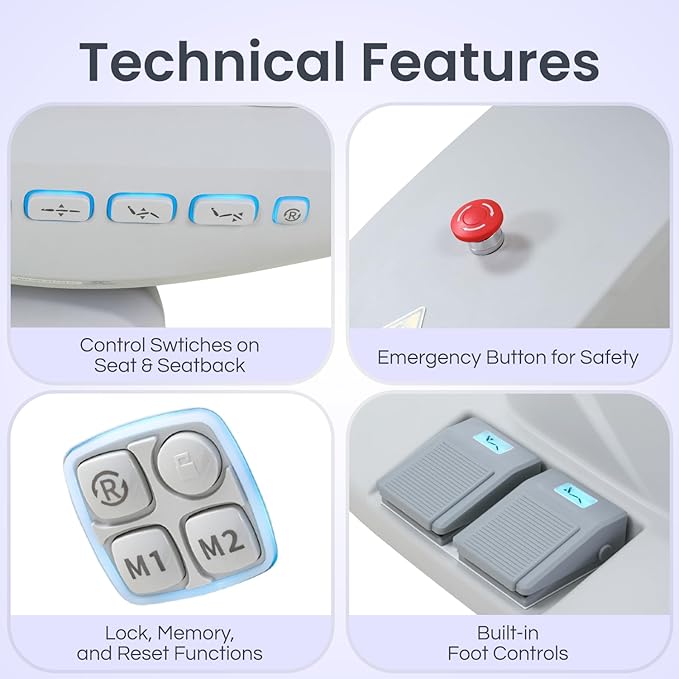 - COMPREHENSIVE CONTROL SYSTEM: Features intuitive back control panel with memory settings, reset button, secure locking function, safety sensors, emergency stop switch, customizable LED lighting, fully adjustable headrest and removable armrests. This professional facial chair for esthetician use combines safety features with convenience, offering the ultimate service bed experience for both clients and technicians.