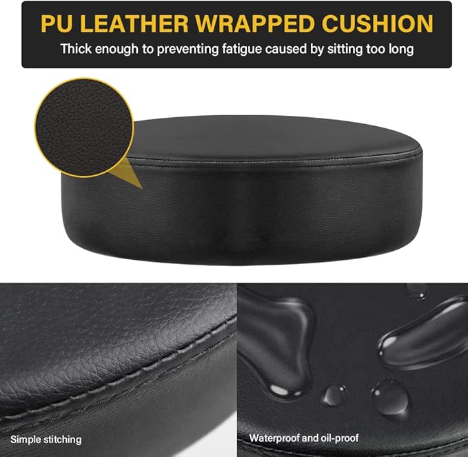 - Heavy Duty Rolling Stools: Seat Diameter 13.8’’, thick 3.5’’. Stool height 19.2’’-26’’. Maximum load 300 lbs. Round seat thick enough, which makes your experience more soft and comfortable.