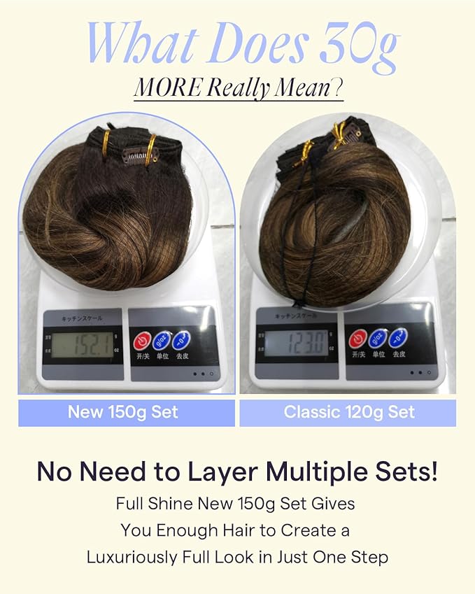 - 25% Thicker Volume for Natural Look: Full Shine upgraded 150g design provides significantly more hair than standard 120g sets. Say goodbye to thin, stringy ends and get a full, voluminous look from roots to tips. Specially designed to add the perfect amount of body to fine or medium hair types, providing a fuller look that feels and moves naturally