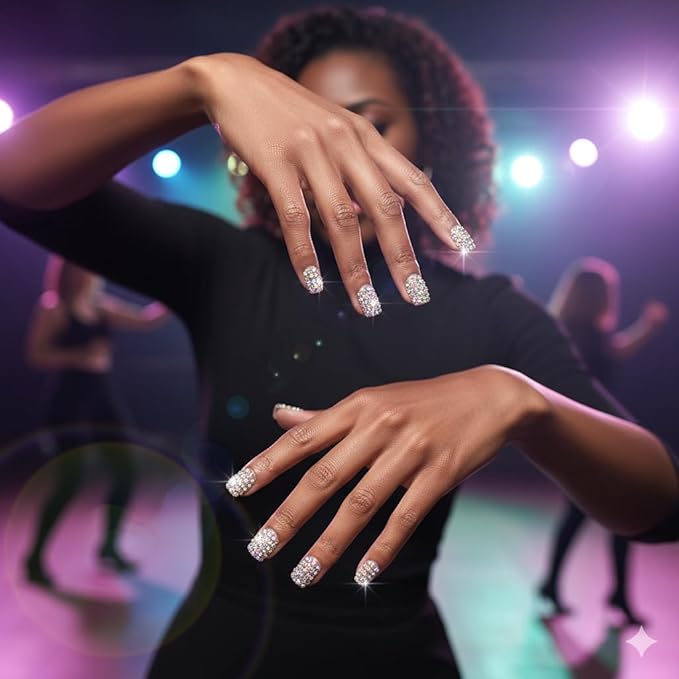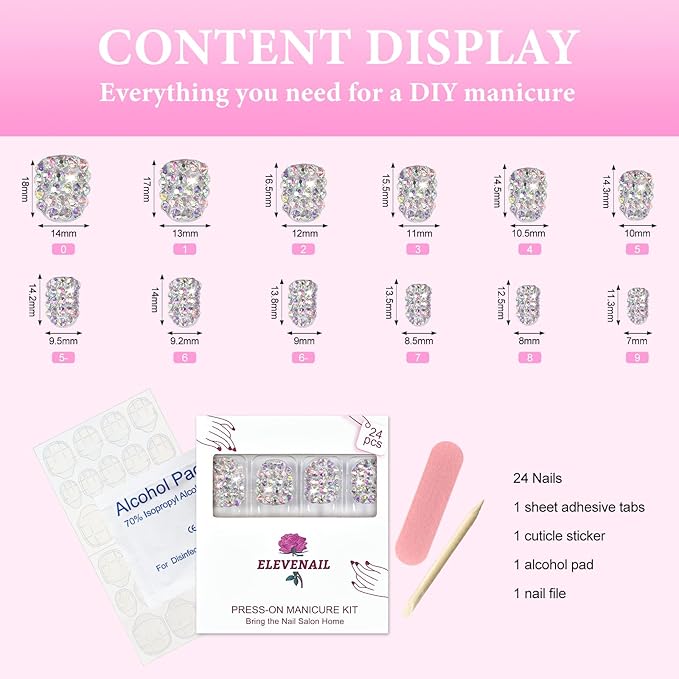- 1. About the nails-Short square press on nails.With full 3D bling bling rhinestones nail art tips as the pictures show,make you more charming and happy.The nails are so nice like you’ve had them done at the salon, You can wear them at anywhere, saving lots time for you.