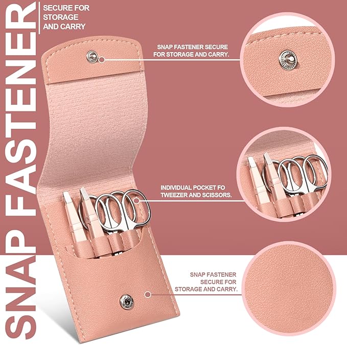 - Professional Eyebrow Grooming Kit: The eyebrow kit comes with 1pcs small eyebrow scissors curved tip, 1pcs eyebrow scissors rounded tip silver. 1pcs eyebrow tweezers slant tip, 1pcs eyebrow tweezers flat tip. 1pcs eyebrow razor and 1pcs eyebrow brush. Total 6pcs eyebrow trimming tools with leather travel case portable and orderly. One kit includes 6pcs practical and essential accessories for eyebrow.