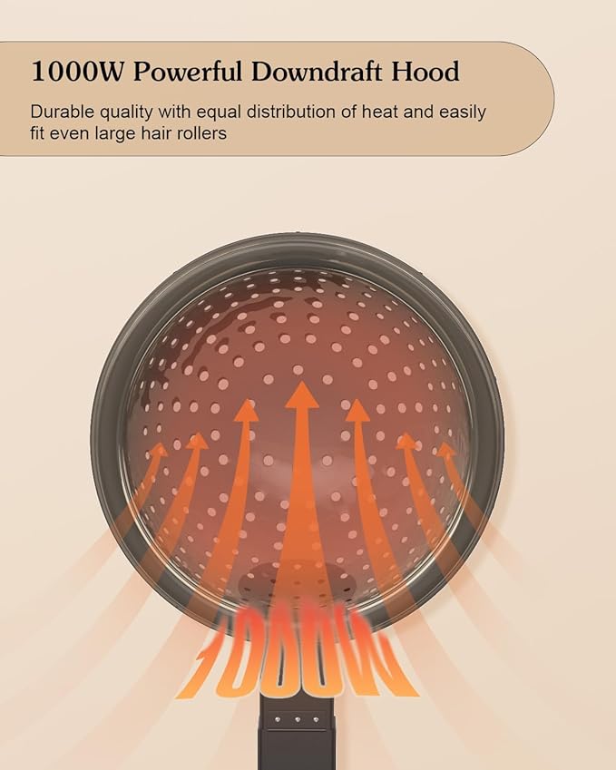- Angle & Height Adjustable - Features an extra large 13.8"D hood to comfortably cover rollers of all sizes. Note: you need to wear hairnet before conditioning. Fully adjustable hood allows for tilting 0-70°, up and down to suit your position, and the arm can be raised an additional 7" height for tall clients.