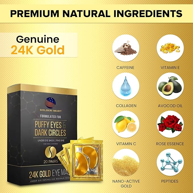 - Combat Puffiness & Dark Circles: Our 24K Gold under eye patches are an effective solution for reducing dark circles and puffy eyes. Infused with active ingredients like caffeine to stimulate circulation and reduce fluid buildup, and vitamin C to even out skin tone, these eye masks leave the under-eye area visibly brighter and more youthful.