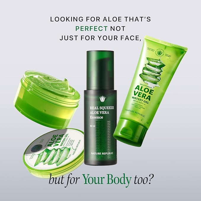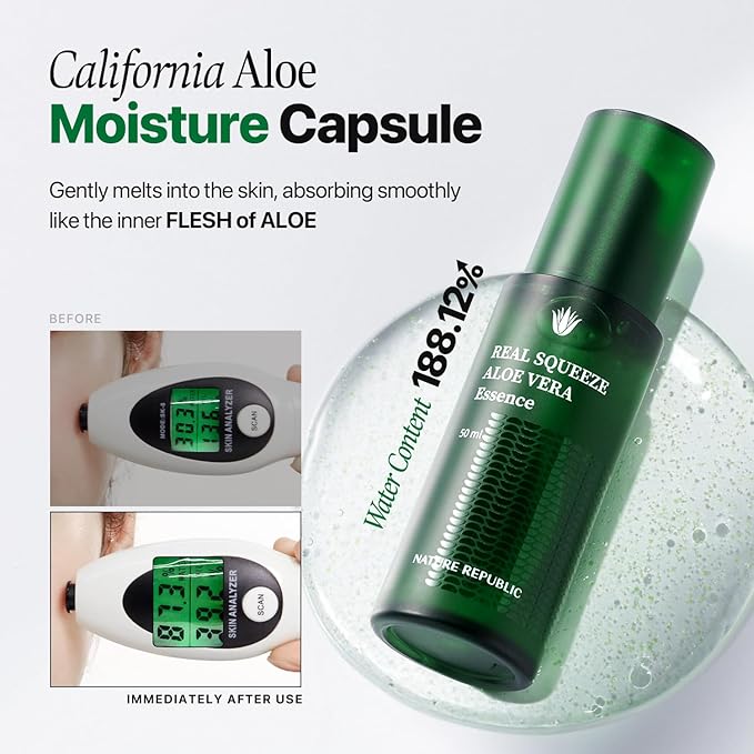 Nature Republic Real Squeeze Aloe Vera Essence -Hydrating Moisturizer & Glow for Face Fast-Absorbing, Non-Sticky After Sun & Aftershave Korean beauty Care for all Skin types Vegan 50ml / 1.69 Fl Oz