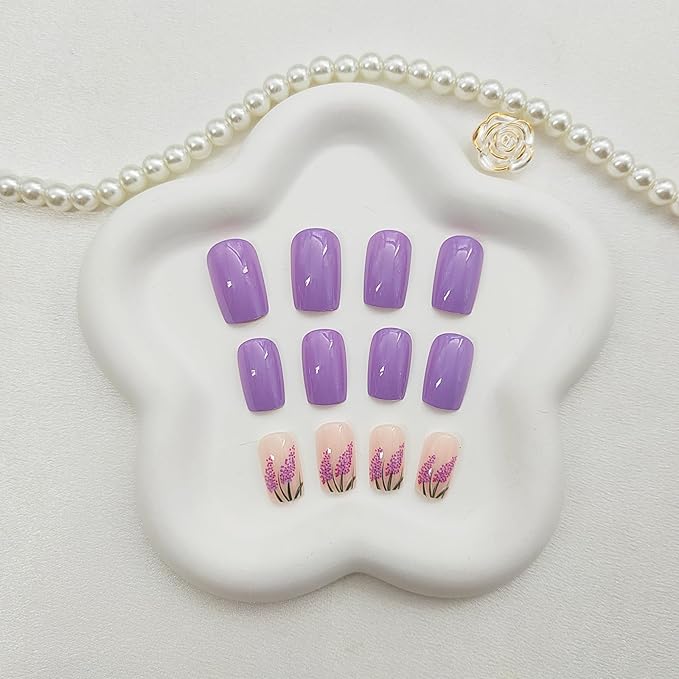 Square Press on Nails Medium Fake Nails with Lavender Floral Designs Glossy Glue on Nails Summer Acrylic Nails Purple Full Cover Artificial Stick on Nails for Women 24Pcs
