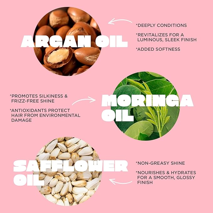 - GOOD FOR YOU INGREDIENTS: We pour in safflower, sweet almond, macadamia, coconut, moringa and argan oils to give your hair weightless shine & up to 48 hours of frizz and flyaway control (hair types include: straight, wavy, curly).
