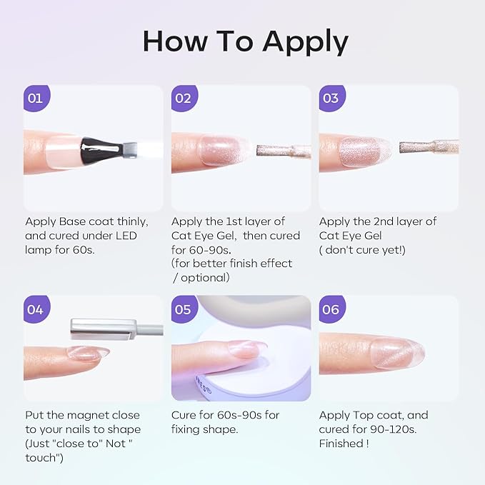 - Tips: Hold the magnet 3-5mm above the surface for 5-10 s to achieve your desired effect! Each Modelones 9D glassy cat eye gel polish is expertly mixed with metallic magnetic glitter powders for a shiny finish. Different angles create different visual effects