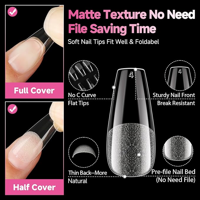 - 【Updated Inner Deep Matte】Our medium coffin gel nail tips have been upgraded with an inner large-grain deep matte texture, providing stronger adhesion to your natural nails. The pre-etched coffin shape saves you time by eliminating the need to file false nails
