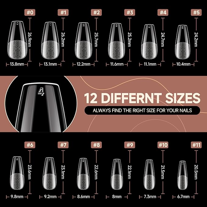 - 【12 Sizes of Nails Tips】The nail extension gel set includes 504 medium coffin gel nails in 12 different sizes, neatly packed in an elegant box. Each size is labeled from 0 to 11 at the top, making it easy to find the suitable size for each nail, allowing you to quickly create and design nail art