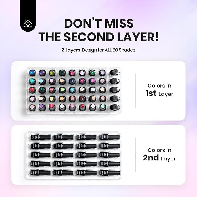 - 【28+ Days Long Lasting】Beetles 60 colors nail polish gel gift set has very high adhesion, with hard and durable quality, good flexibility, and perfect glossy,making nails look natural and light. After using and lighting properly (requiring curing with UV/LED light for 60-90 seconds), it can maintain the color and gloss of nail art for more than 28 days.