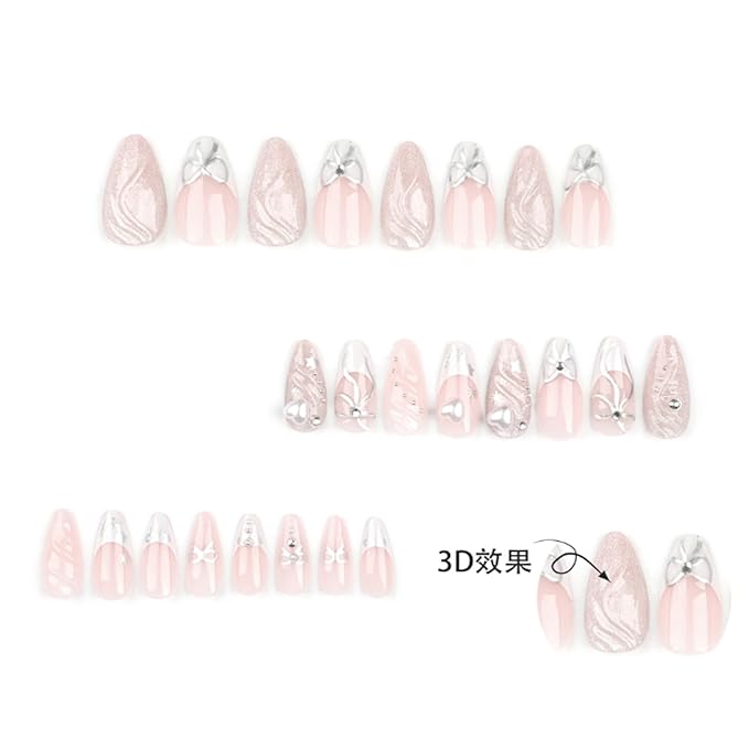 Hkanlre Cute Press on Nails Silver Fake Medium Nails Tips Full Cover Almond French False Nails for Women and Girls 24PCS