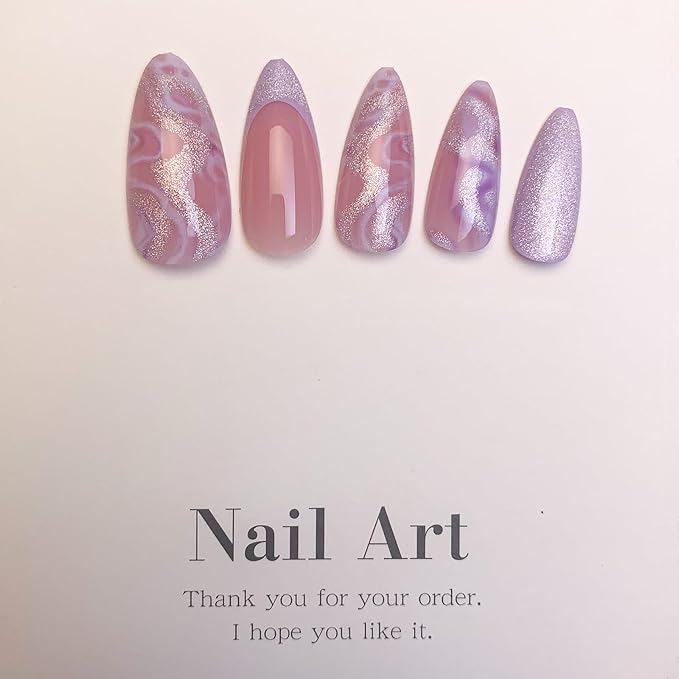 - Almond Press on Nails: There are 24 nude purple nails press on nails in one pack,Beautiful and cute short press on nails glitter false nails comes with has 12 different sizes.Brush the nail with a coat of polish if you want it to last longer
