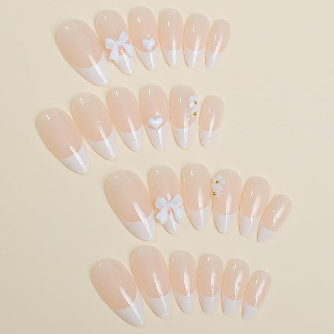 French Tip Press on Nails Medium Almond Fake Nails Bow Charms Stick on Nails with White Nail Tips Designs Heart Flowers Acrylic Nails for Women Girls 24Pcs