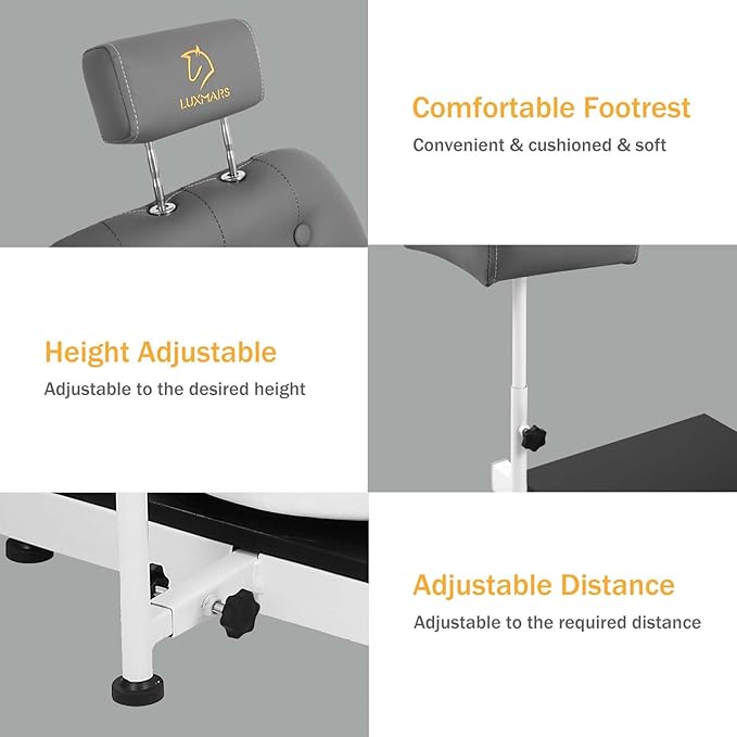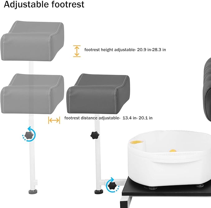 - 【Adjustable Foot Rest】 The height and distance of the foot pedal of the pedicure station can be adjusted, and the height of the footrest can be adjusted from 21 inches to 28 inches. The distance can be adjusted from 13 inches to 21 inches, with a thickness of 4.3 inches to adapt to customers of various heights, allowing every customer to find a suitable and comfortable position.