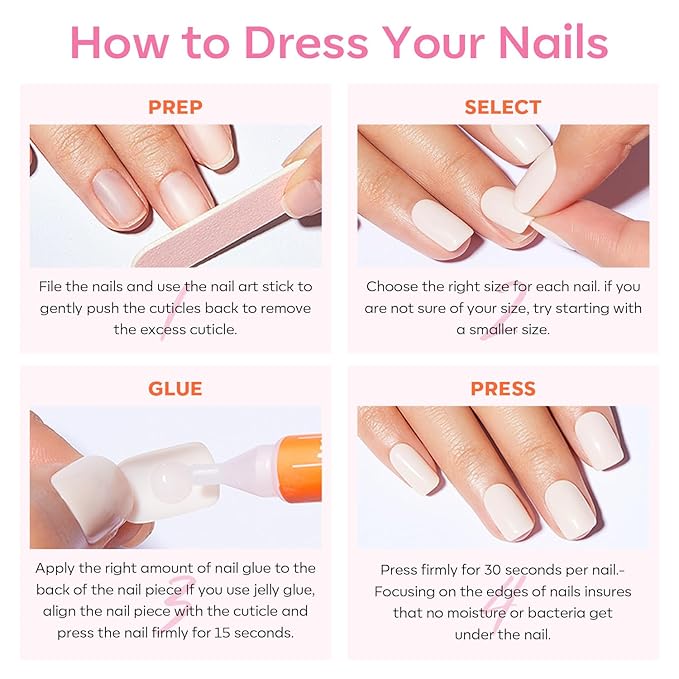 - 【What you will get】This Full Cover glue on nails set comes with 32 pcs reusable false nails in 16 different sizes to suit each finger, along with 2 sheets of nail adhesive taps for convenience, 1 pc nail glue for durability, 1 mini nail file and 1 cuticle stick for flawless application, and 2 prep pads for clean nails.