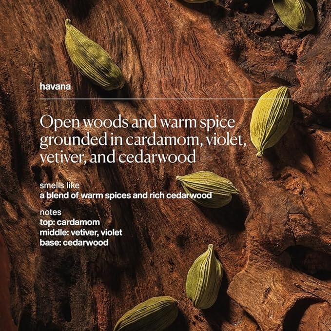 - UNIVERSAL SCENT AND DESIGN: Made for everyone, featuring Havana’s warm scent grounded in cardamom, violet, vetiver, and cedarwood, appealing to all genders.