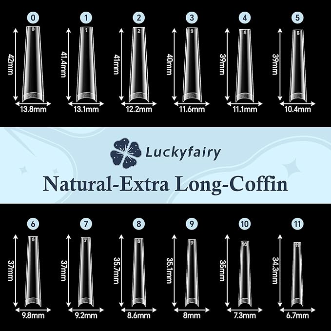 - 【12 Size To Fit Most Fingers】Extra long coffin acrylic nails tips designed with 12 differnet sizes numbered from (0-11), can fit for most fingernails, no matter you have wide/large, narrow/small or medium nail beds, you can always find suitable nails tips to fit your every finger nails.