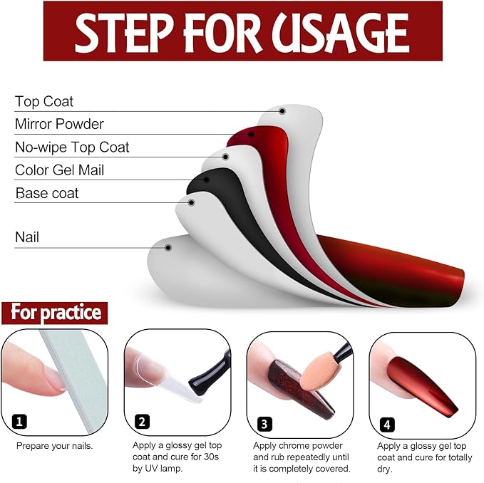 - 【WIDE APPLICATION】:These powders need to be used with Gel nail polish(color gel,gel base coat and glossy gel top coat). Some regular Polish can also be used, but not all. These powders can be used on natural nails, UV gel nails, acrylic nails or false nail tips. You can use them very easily. It is a good solution with rhinestones 、nail art fimo or other accessories to build a nice nail art.