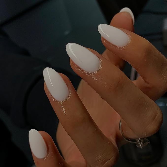 White Press on Nails Short Almond Fake Nails Press ons, Thick Solid Color Glue on Nails Short False, Medium Almond Oval Round Shaped for Women, 24Pcs Natural Acrylic Gel Nail