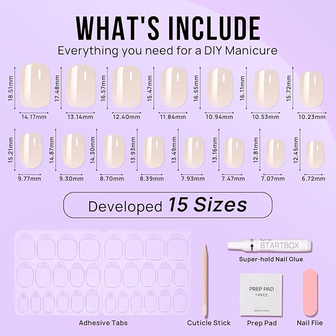 - What's Include:15 nail sizes ensure a totally custom fit, plus we give you everything needed just in case! Each set comes complete with a storage box, nail glue, adhesive tabs, double-sided nail file, cuticle stick, and prep pad