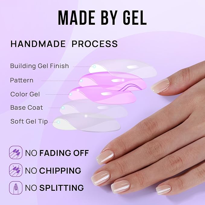 - Made by Gel: We made these press on nails completely follow the handmade process(base coat, color gel, pattern, top coat). The color and patterns are made by gel polish instead of printed by ink. Get salon-like nails in 6 mins