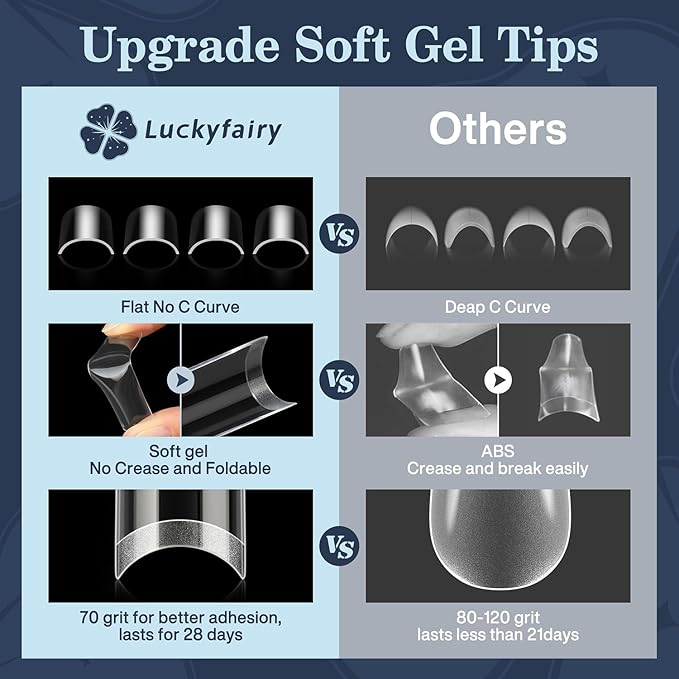 - Wide Application: Luckyfairy Soft Gel Tips can be used for gel nail polish, acrylic nails, dip powder nails, poly nail extension gel, nail decorations, etc. Suitable for both DIY at home and professional nail salons.