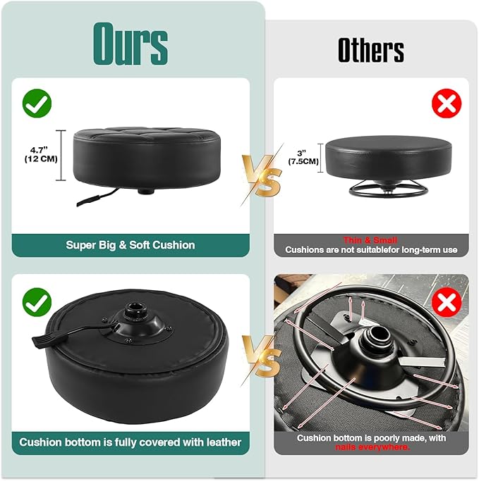 - Super thickened cushion and High-quality leather : Unlike those rolling stool that claim comfort but only provide thin (2"-3") and small cushions, we offer a truly super large and thickened cushion (4.7")which will essentially provide real comfort, not false promises. As shown in the video, this stool chair cushion is scratch-resistant and has a delicate touch, ensuring a very good experience for a long time.