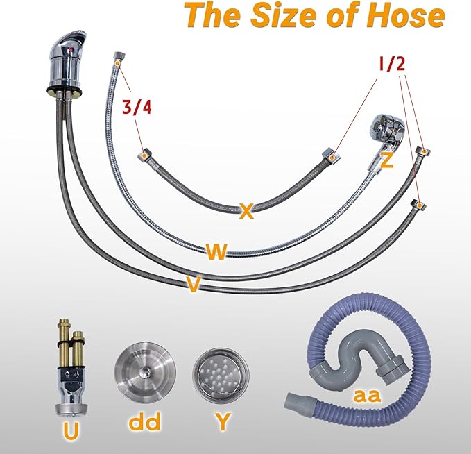 - NOTE: The more detail size of Hose: The size of V (Mixed Water Inlet) connecting to the ground water pipes is 1/2 The size of W (Shower Head Pipe) connecting Z (Shower Head) is 1/2, and the size of connecting U(Valve) is 3/4. The Size of X (Braided Hose) connecting U (Valve) is 3/4,and the size of connecting V(MixedWater Inlet)is 1/2
