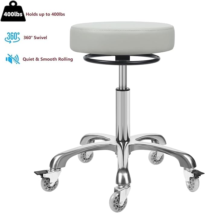 - Very Sturdy and Well Made Stool: This heavy duty rolling stool is constructed of strong aluminum alloy base and heavy duty rubber casters, more durable and load-bearing. The heavy-duty construction supports up to 400 lb. SGS certified gas lift cylinder secures safe and smooth operating