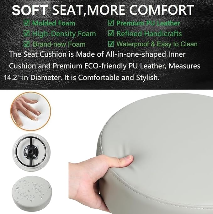 - Comfortable Thick Seat Padding: Stool Chair with 14.5 inches diameter x 3.5 inches thickness gives your bottom optimal comfort. Brand new high density sponge, high-quality bonded leather upholstery, oil and water proof, and easy to clean, with double stitching to made it more durable and comfortable