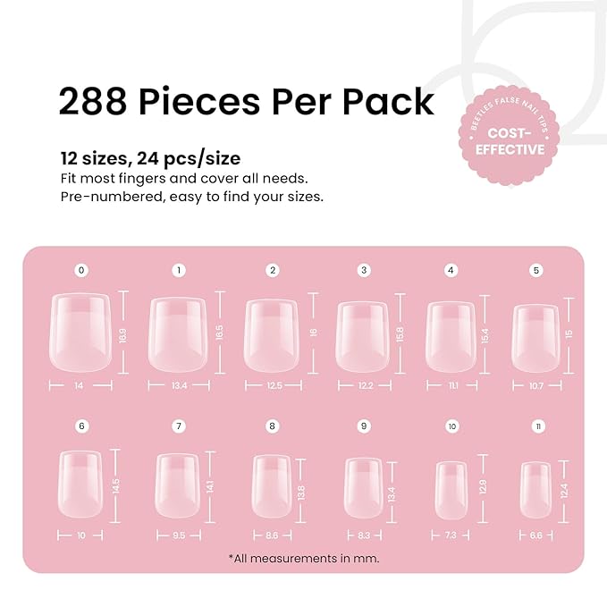 - Short Square Nail Tips: This 288 PCS false nail tips set comes in 12 sizes for effortless matching to each finger. Each nail tip in the half matte series features a thinner edge to fit your natural nails, resembling nails that have grown out naturally.