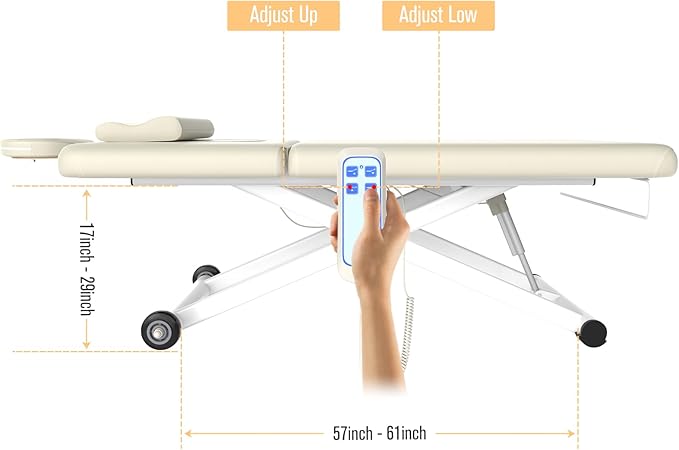 - [PREMIUM ELECTRIC LIFT MASSAGE TABLE] - Electric adjustment of leg height and electric adjustment of backrest tilt angle. Electric remote control to adjust backrest and leg height independently from each other. The electric lift function allows masseurs to easily position the massage bed themselves, without manual adjustments. A remote control holder is set up next to the bed to prevent it from getting lost. You can also easily adjust it yourself to find the most comfortable position.