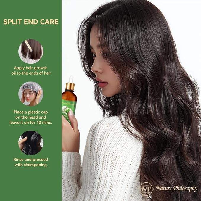 - Method of use - Scalp Care: Divide hair into 4 sections. Apply a small amount of hair growth products to the scalp and massage it in with the fingertips, then comb through to the endsof the hair. Split End Care: Apply hair growth oil to the ends of hair, place a plastic cap on the head and leave it on for 10 mins. Rinse and proceed with shampooing